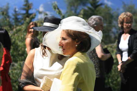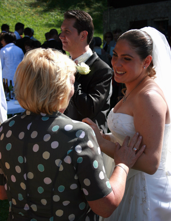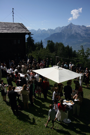 Andrew’s childhood friend, Joerge, is from Bavaria, and his gorgeous Kate Winselt look-alike fiancé, Muriel, hails from Geneva. So when were invited to their wedding, we knew it was going to include some pretty spectacular Old World touches. Their jaw-dropping ceremony was set on a cliff side in the Swiss Alps overlooking the Matterhorn. Their traditional Catholic Mass was conducted at the foot of a 400 year-old outdoor chapel. Throw in a flawless August day, and magic was inevitable!